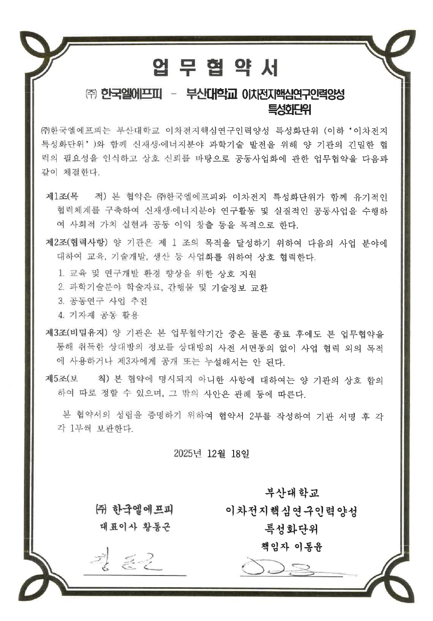 | 2025-12-18 | 부산대학교 | 부산대학교 이차전지 핵심연구인력양성 특성화 단위 업무협약 |